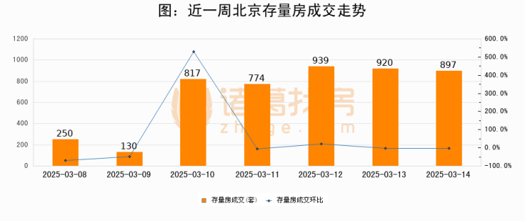从存量房来看,2025年03月14日北京存量房单日成交897套,比昨日减少23套,环比下降2.5%。从近一周存量房成交来看,北京存量房日均成交套数为675套,03月14日单日成交897套,高于近一周平均水平32.9%。