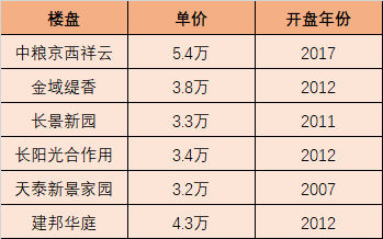 项目周边是长阳板块,若按100%产权估算,单价差不多在3.4万左右。对比周边新房价格比较有优势,但是如果你不介意房龄,选择就更多了。以下是项目附近一公里楼盘二手房价格比较: