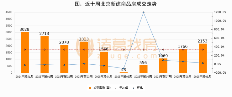 进入2025年第09周(02月24日-03月02日),北京新建商品房成交2153套,较上周增加387套,环比上涨21.9%