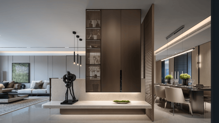融创壹号院全新实景区域的一大亮点,在于对“归家动线”的定制设计和建造品质的完整呈现。其中,社区大堂的呈现令人印象深刻,贝母艺术穹顶呼应细腻的暖色石材地面,营造出回家的暖意与仪式感。从社区入口到单元大堂、从地下车库到电梯厅,各处空间注重了材质搭配与光影氛围,归家过程松弛且有序,有如高奢酒店式的礼制体验,使客户能够直观感知未来的生活图景。