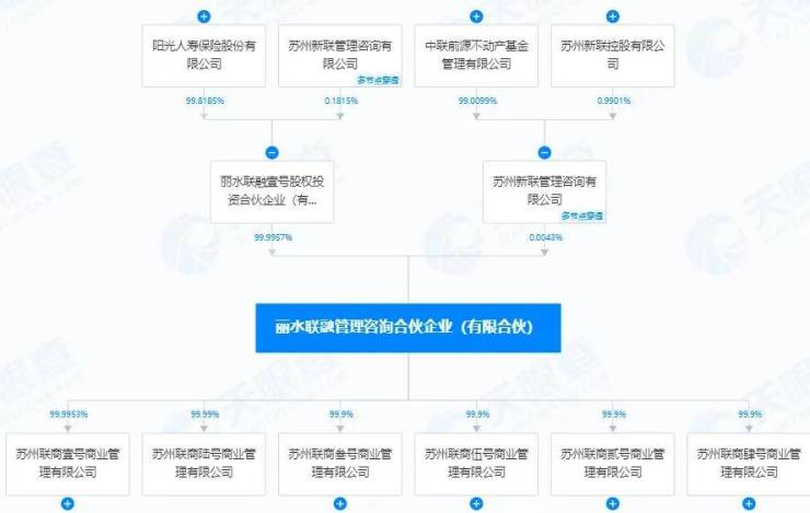 天眼查显示,受让万达商管部分公司的联商壹号、贰号、叁号、肆号、伍号,背后全资股东均为丽水联融管理咨询合伙企业(有限合伙),后者的执行事务合伙人为苏州新联管理咨询有限公司,大股东为中联前源不动产基金管理有限公司。