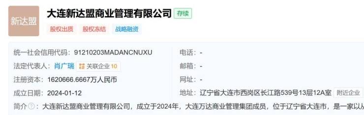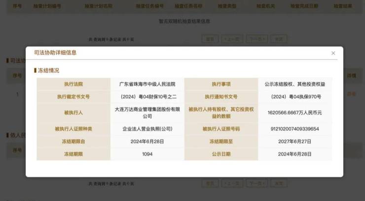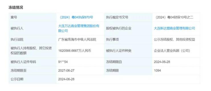 据天眼查App,近日,大连新达盟商业管理有限公司新增一则股权冻结信息,被执行人为大连万达商业管理集团股份有限公司,冻结股权数额约162亿元,冻结期限自2024年6月28日至2027年6月27日,执行法院为广东省珠海市中级人民法院。