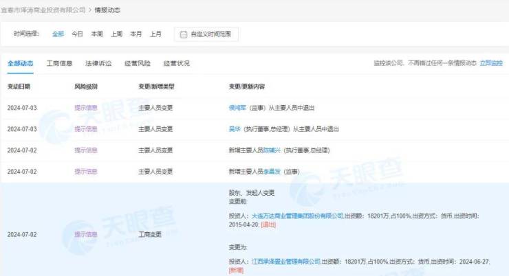 天眼查App显示,7月2日,宜春万达广场投资有限公司发生工商变更,原全资股东大连万达商业管理集团股份有限公司退出,新增江西承泽置业管理有限公司为股东,并全资持股,同时企业名称变更为宜春市泽涛商业投资有限公司,法定代表人及主要人员也均发生变更。