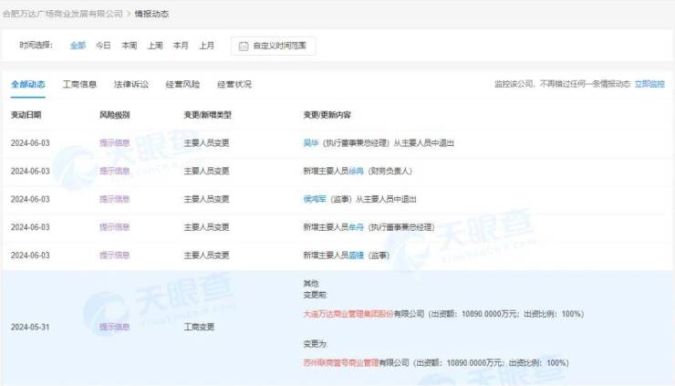 5月31日,合肥万达广场商业发展有限公司发生多项工商变更,原全资股东万达商管退出,新增全资股东苏州联商壹号商业管理有限公司。