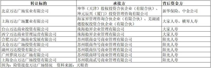 据中国基金报统计,接盘万达商管相关公司的险资包含新华保险、大家人寿、横琴人寿、阳光保险等。