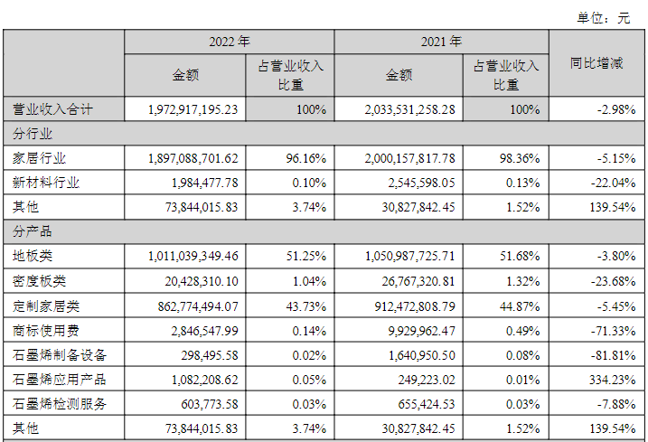 回溯其业务拓展历程,德尔未来原主营业务为木地板,也曾凭借这一产品年赚过亿。2016年公司以原主业为基础收购百得胜转型做定制家具,不久后跨界进入石墨烯行业。