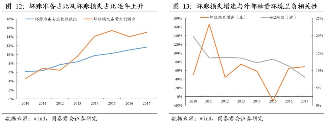 3、存货属于业务流程对公司资源的占用,而应收账款可能存在计提坏账损失且与外部融资环境高度相关。1)存货和应收账款属于业务流程对公司资源的占用,与收入增速对比可反映业务扩张的经济效率以及资产质量; 2)应收账款作为主营业务形成的债权需考虑计提坏账损失问题,与外部融资环境高度相关:外部资金面较为宽松时工程结算也较快因而坏账准备和损失也较少,反之则越高。比如2011年M2增速大幅放缓导致国内资金面偏紧,园林板块当年度坏账损失同比增长达167%,2012年M2增速回升后坏账损失增速大幅降低至44%。