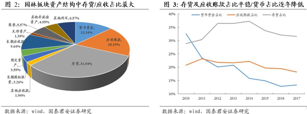 基于商业模式的差异,园林板块的资产结构以及变动规律较其他消费类行业有较大差异。从资产结构端来看,园林板块的资产主要包括存货、应收账款、货币资金、其他非流动资产、长期应收款、商誉等。其中货币资金、存货、应收账款是园林板块资产端较重要的三类资产: