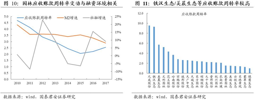 应收账款回收节奏同样明显受外部融资环境影响,我们对比了2010-2017年园林板块应收账款周转率变动趋势,与存货完全一致:2011-2015年逐年降低,2016年开始上行。