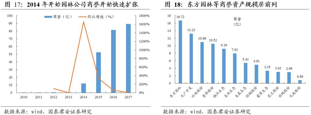 5、商誉是反映公司利润潜力和盈利风险的双刃剑。1)行业低谷或新业务模式渐成熟时外延并购增多导致商誉快速增长;2)以园林为例,2014年园林板块收入增速放缓/估值较低,同业收购及新进入者并购案例增多导致商誉暴增近17倍;2015-2016年行业面临转型,上市公司并购新业务领域标的(环保/文旅)案例增多导致商誉增加,占资产比超7.3%。