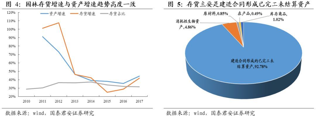 1)2010-2017年以来,存货和应收账款与收入增速基本维持了同升同降的趋势,符合园林工程施工业务流程推演逻辑,也印证了在园林工程施工商业模式下存货和应收账款形成是刚性环节;