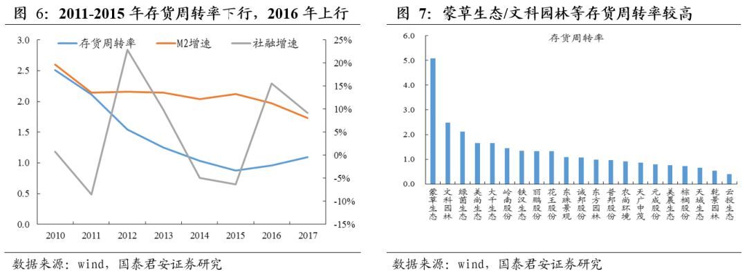1)2011-2015年园林板块存货周转率持续下行,这里面分成两个阶段:2011年信贷收紧导致地方政府和地产商现金流较紧,放满了相应工程相关结算速度,2012年继续降低或主因政策效果的滞后效应;2013-2014信贷收紧和园林公司业务转型背景下,收入增速放缓、结算放缓,2015年继续降低原因与2012年类似;
