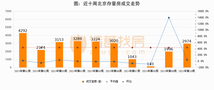 存量房方面,第09周北京存量房成交2974套,较上周增加978套,环比上涨49%。从近十周成交走势来看,周均成交套数为2529套,本周高于平均水平17.6%。