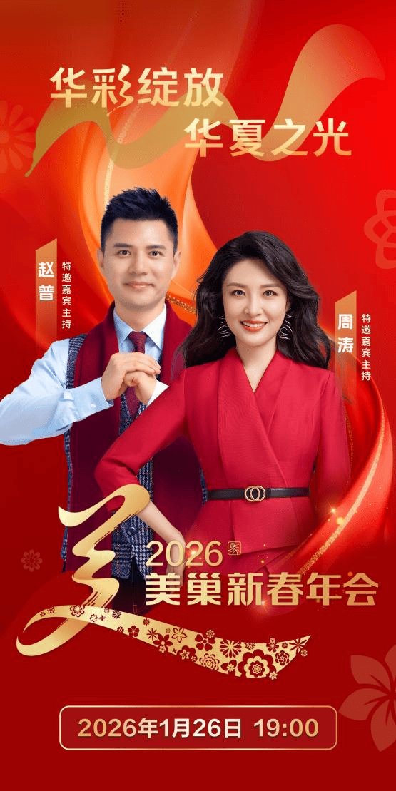 作为美巢一年一度的年度盛典,这场相约早已成为固定的“年终坐标”——每到岁末,同一份期待如期汇聚,同一份热烈准时点燃。2026年1月26日19:00,以“华彩绽放·华夏之光”为主题的2026美巢新春年会将盛大开启。周涛、赵普再度联袂加盟,重磅助阵;更有来自“四大矩阵”合作伙伴的神秘嘉宾惊喜现身,共同为美巢的合作伙伴、同事及家人们奉献一场气氛热烈、荣光满场的年度盛典。