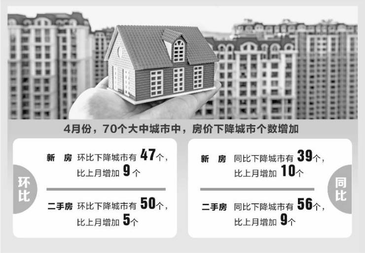 国家统计局的数据显示,4月份,70个大中城市中,房价下降城市个数增加。其中,新房价格环比下降城市有47个,比上月增加9个;二手房价环比下降城市有50个,比上月增加5个。新房价格同比下降城市有39个,比上月增加10个;二手房同比下降城市有56个,比上月增加9个。