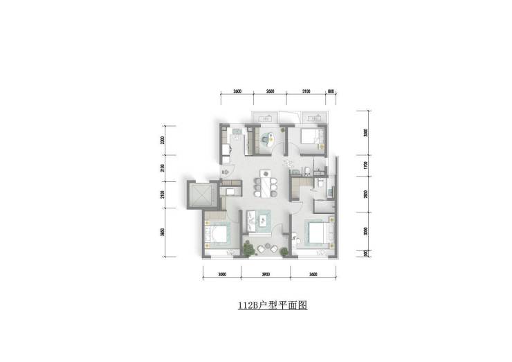 112㎡四室两厅两卫(128 套):南北通透全明四房,主卧配270°转角景观窗,客餐厅宽 3.9 米,收纳空间充足。