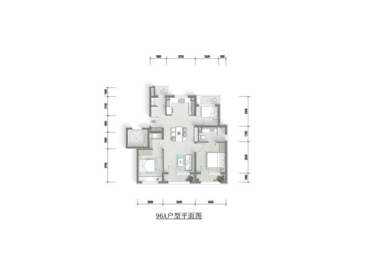 96㎡三室两厅两卫(260 套):南北通透,南向三面宽全明设计,客餐厨LDK一体式布局,双卫配置,餐厅旁设独立家政间。
