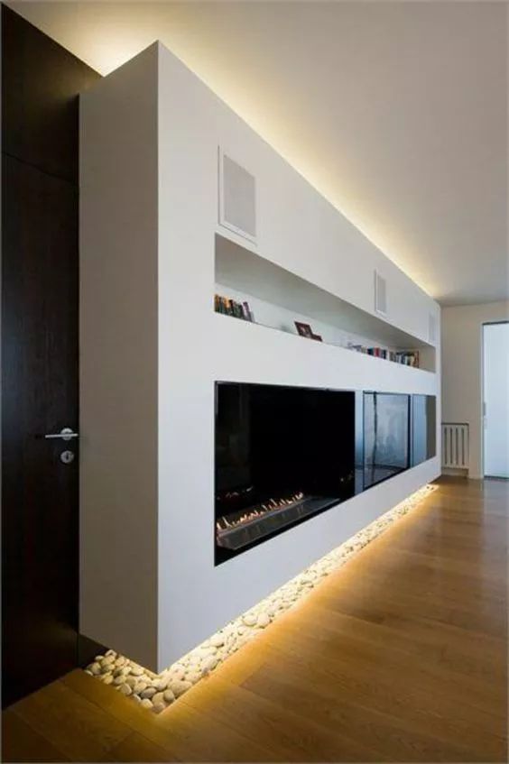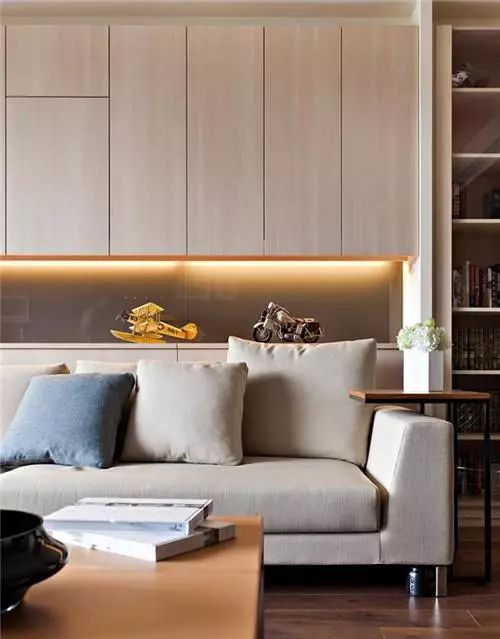 #方法五#如果不喜欢在墙面或天花做文章,在装饰柜、书柜或壁柜的上下安装灯带也是不错的。灯带会将光投向天花和地面,既解决了客厅的采光问题,又将局部其作为空间重点突出,成为视觉焦点,弱化采光不足带来的不适感。
