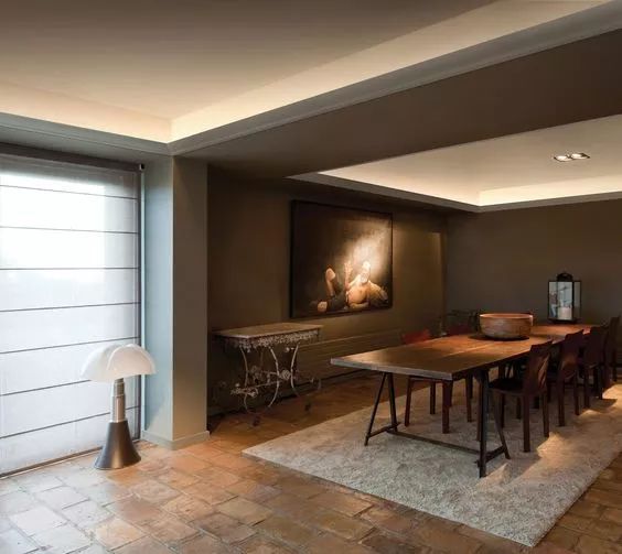 不同形状的地毯选择也能削弱深红色地板带来的刻板印象。同时,在夜间,配置一些柔和的落地光源,也能很好的柔化和亮化深色的地面。