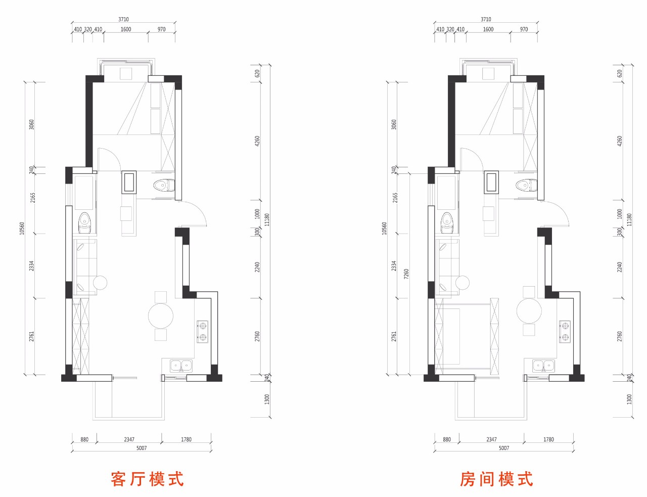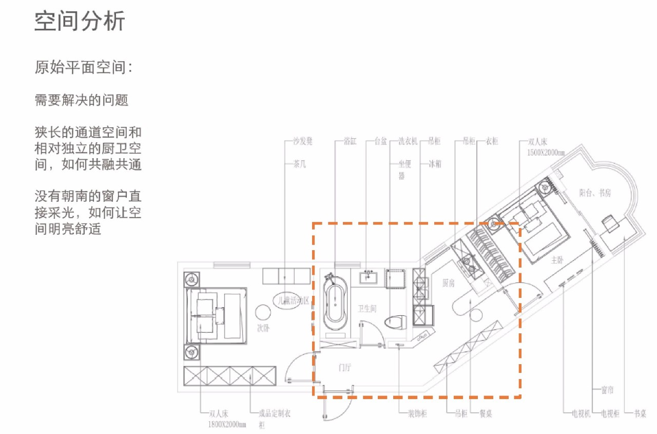 排名前列个房型的特点是房间在两边,中间连着厨房和卫生间,本来就不大的面积被过道占据了1/3。我们较终将卫生间以及厨房区域和过道空间做结合,将功能灵活化,从而达到空间的合理运用。