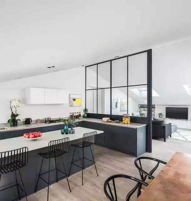 #方法一#将客厅与房间之间的隔断进行改造,使用玻璃隔断,让光成为房间与房间之间的联通桥梁。无论是从外面窗户照射进来的自然光,或卧室里的灯光,透过玻璃隔断都能给黑暗的客厅带入光感,同时亦营造了空间上的通透感。