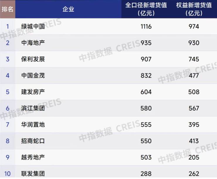 在今年前7个月房企全口径新增货值榜上,绿城中国、中海地产和保利发展位列前三,金额分别为1116亿元、935亿元、907亿元。TOP10企业全口径新增货值总额6871亿元,占TOP100企业的43.5%,TOP100企业新增货值门槛为55亿元。