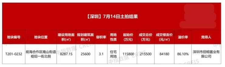 7月14日,深圳前海深港合作区核心桂湾片区一宗宅地出让,共吸引12家房企角逐。经过158轮激烈竞价,该地块被招商蛇口以总价21.55亿元、楼面价84180元/平方米、溢价率86.10%竞得。这也是时隔十年,深圳宅地楼面价首次突破8万元/平方米关口,成为深圳单价“地王”。
