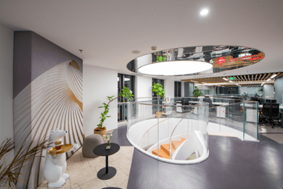 历经一年多的设计改造,在保持主体结构、建筑高度、容积率等指标不变的情况下,开发团队打开所有非承重墙,重构室内空间,重塑室外建筑形象。外观上延续原有的对称及门框式设计,大比例增加玻璃的使用面积,搭配石材的厚重,彰显建筑现代感和力量感。内部采用暖色调设计风格,打造开敞式办公空间,对照明系统、空调系统、强弱电系统、电梯等硬件设施全面升维,例如,增设新风机组和空调过滤系统,新风量大于30m/h,满足冬季PM2.5除尘需求。