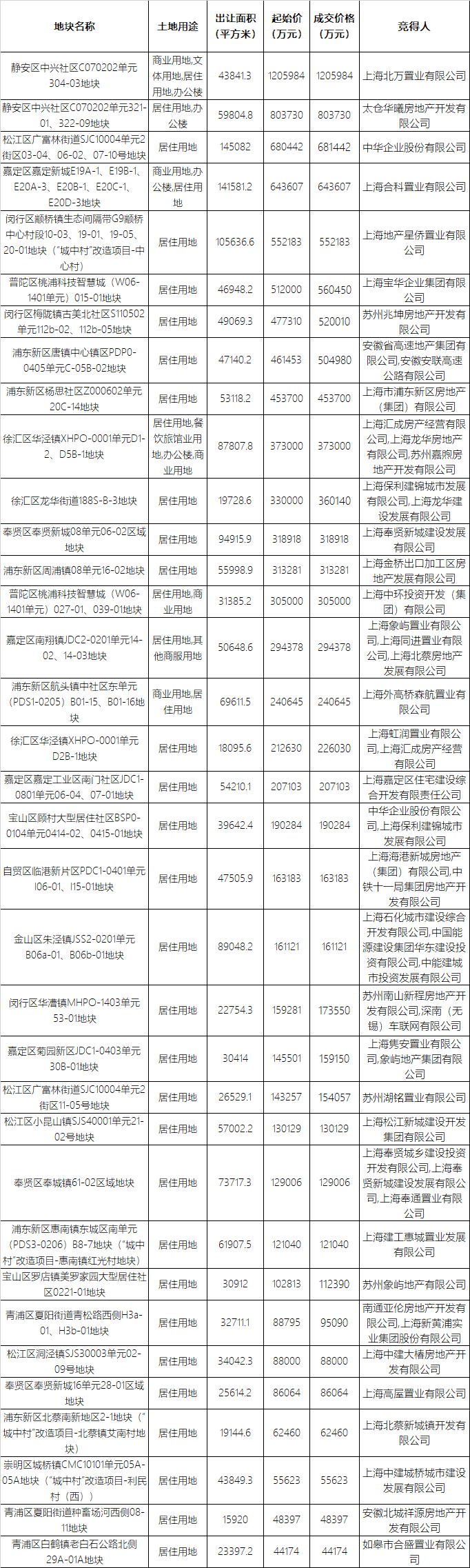 本批次地块出让活动中,象屿地产集团有限公司收获最多,竞得3宗地块,总地价为56.6618亿元。其中,宝山区罗店镇美罗家园大型居住社区0221-01地块和嘉定区菊园新区JDC1-0403单元30B-01地块均触及中止价,转入一次性报价后成交。