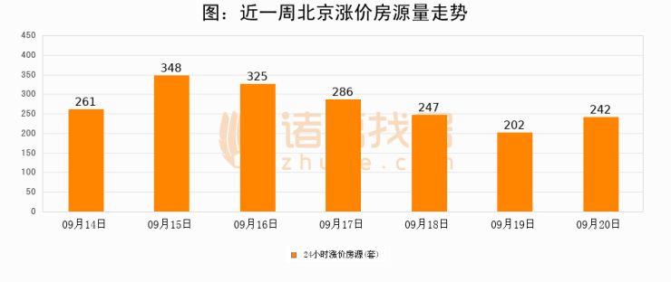 根据诸葛找房数据显示,北京24小时涨价房源量为242套,较09月19日增加40套,环比上涨19.8%。与此同时,涨价房源占比小幅扩大,业主信心有所提升。