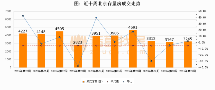 存量房方面,第29周北京存量房成交3245套,较上周增加78套,环比上涨2.5%。从近十周成交走势来看,周均成交套数为3805套,本周低于平均水平14.7%。