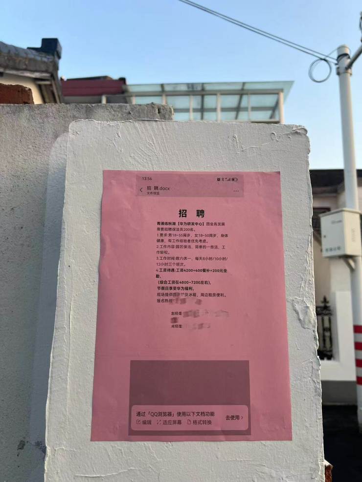 本次,观察者网在华为练秋湖研发中心周边的村落中,也发现了不少研发中心散布的后勤招聘广告,大厂功能的溢出效应正在显现。严跃进表示:“华为的辐射效应非常强劲,它将带动整个区域的发展,改变人们对这个板块的认知程度”。(文中高雅为化名)