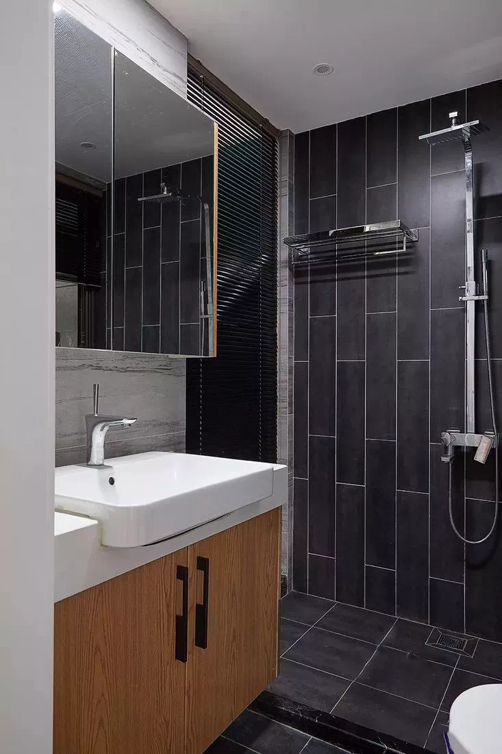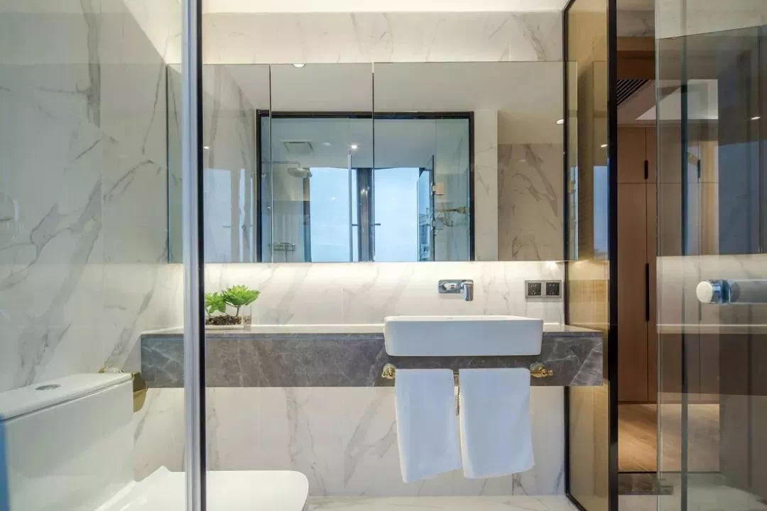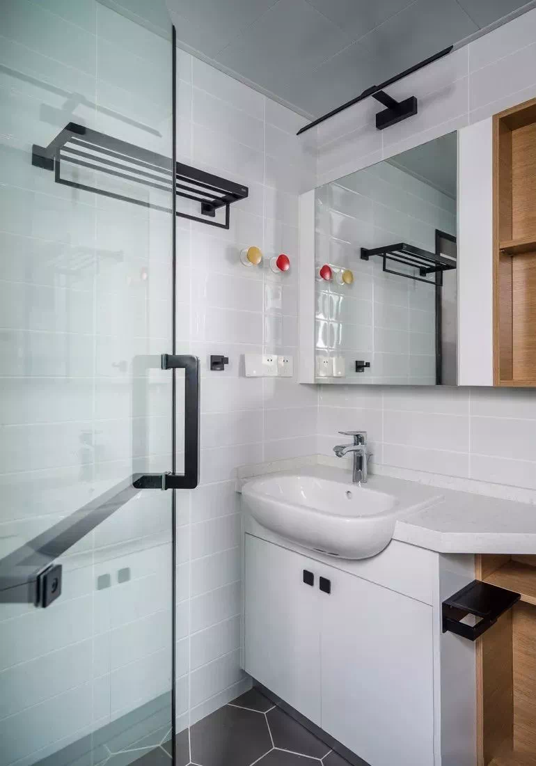 像一些比较小的卫生间,就可以选择缩减浴室柜的面积,然后把台盆给突出来,这样洗手台整体占据的面积也小了,淋浴房和马桶更好布置。