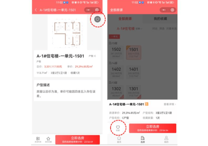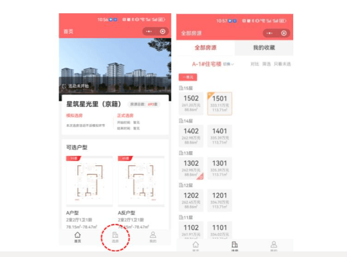 3.点击界面底部中间“选房”按钮进入选房活动页面,有项目各楼栋房源情况,可进行房源收藏(最多可收藏15套房源,需随时关注房源是否已被选定,可根据前序客户选房情况随时更新收藏房源)。
