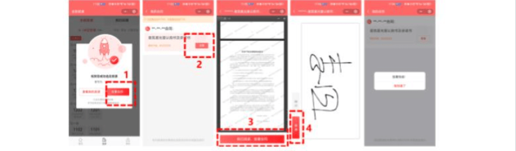 5.锁定房源后,需点击“签署合同”(下图中1),点击“立即签署”(下图中2),系统会显示“《认购书》和《承诺书》”,阅读完毕后点击“我已阅读,签署合同”(下图中3),签字完成后点击“使用”(下图中4)即完成签订。申购家庭需于认购当日19:00前完成签署。