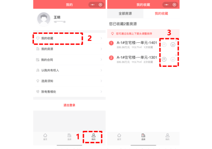 点击房号右侧上下箭头可调整收藏房源顺序(下图中3)。