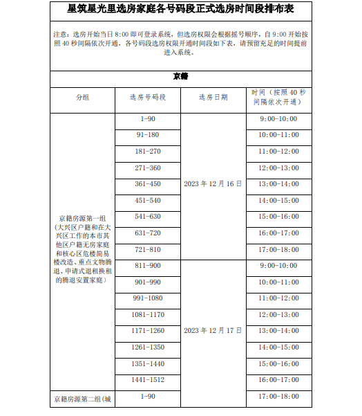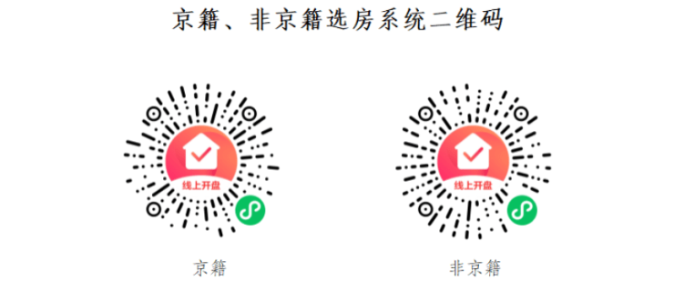 2.登录:购房家庭应按《星筑星光里选房家庭各号码段正式选房时间段排布表》(详见附件1)中公示的选房时段,提前连接配置好4G/5G或WIFI网络,扫描京籍、非京籍对应的选房系统二维码(详见附件2)。线上选房全过程视为申购人本人操作。