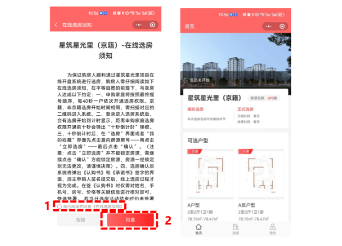 2.登录后,仔细查看线上选房须知并勾选“我已阅读并同意”(下图中1),点击“同意”按钮(下图中2),进入系统首页。系统“首页”将展示房源数量、户型和线上选房时间等信息。