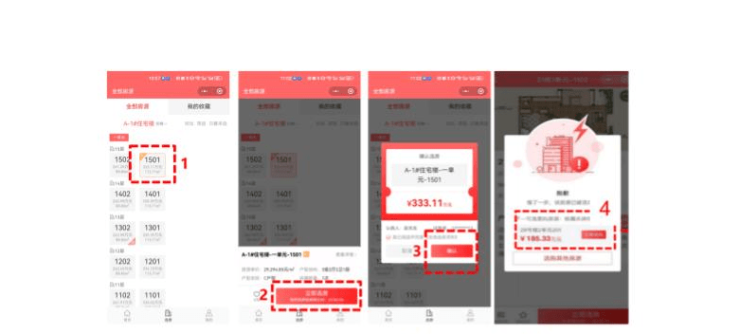 4.正式选房时按照摇号顺序,到达相应申购家庭选房权限开通前10秒,会出现倒计时提醒。客户点击相应房号(下图中1)或者从收藏房源列表里点击意向房源→点击“立即选房”(下图中2,注意:点击“立即选房”后并不能锁定房源)→点击“确认”(下图中3,注意:点击“确认”后才能锁定房源,房源一经确认将不可更改,请谨慎决策)。如点击确认不及时,所选房源有可能被其他客户选定,系统将按照收藏顺序依次推荐收藏房源,可点击“立即选购”(下图中4)后点击“确认”锁定房源。
