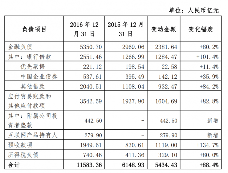 一是金融负债中的银行借款余额较2015年末新增近1284亿元,涨幅超101%。这一涨幅主要是由于2016年恒大集团通过与众多银行签署战略合作协议,获取了大量新增授信额度;