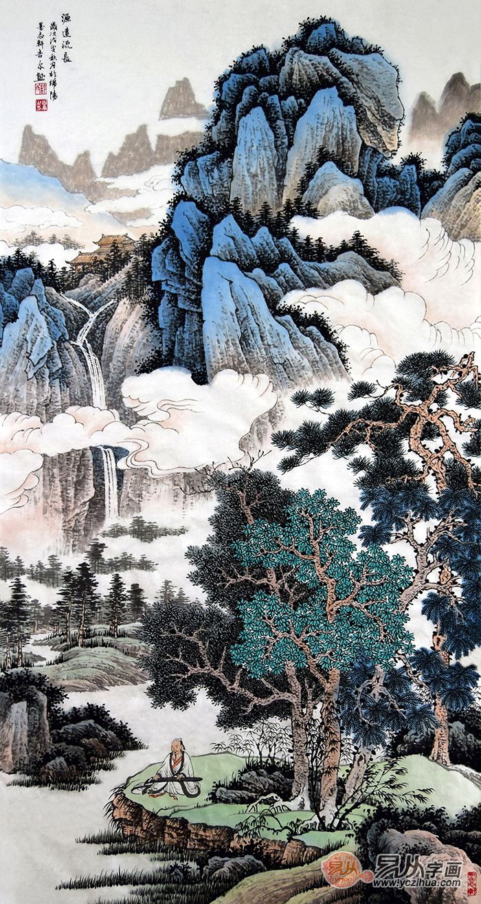 许吉尔老师的《源远流长》山水画中的山峰采用蓝色描绘,高耸入云,象征着财源的瀑布水滚滚而下,汇集到山间的湖泊中,山间植物茂盛,其中以松树居多,多有旺财之意;近处的松树下,一位雅士在弹奏古琴,意境雅致,禅意人生,将山间的自然美景酣畅淋漓的展现出来,是极为经典的进门玄关装饰画!