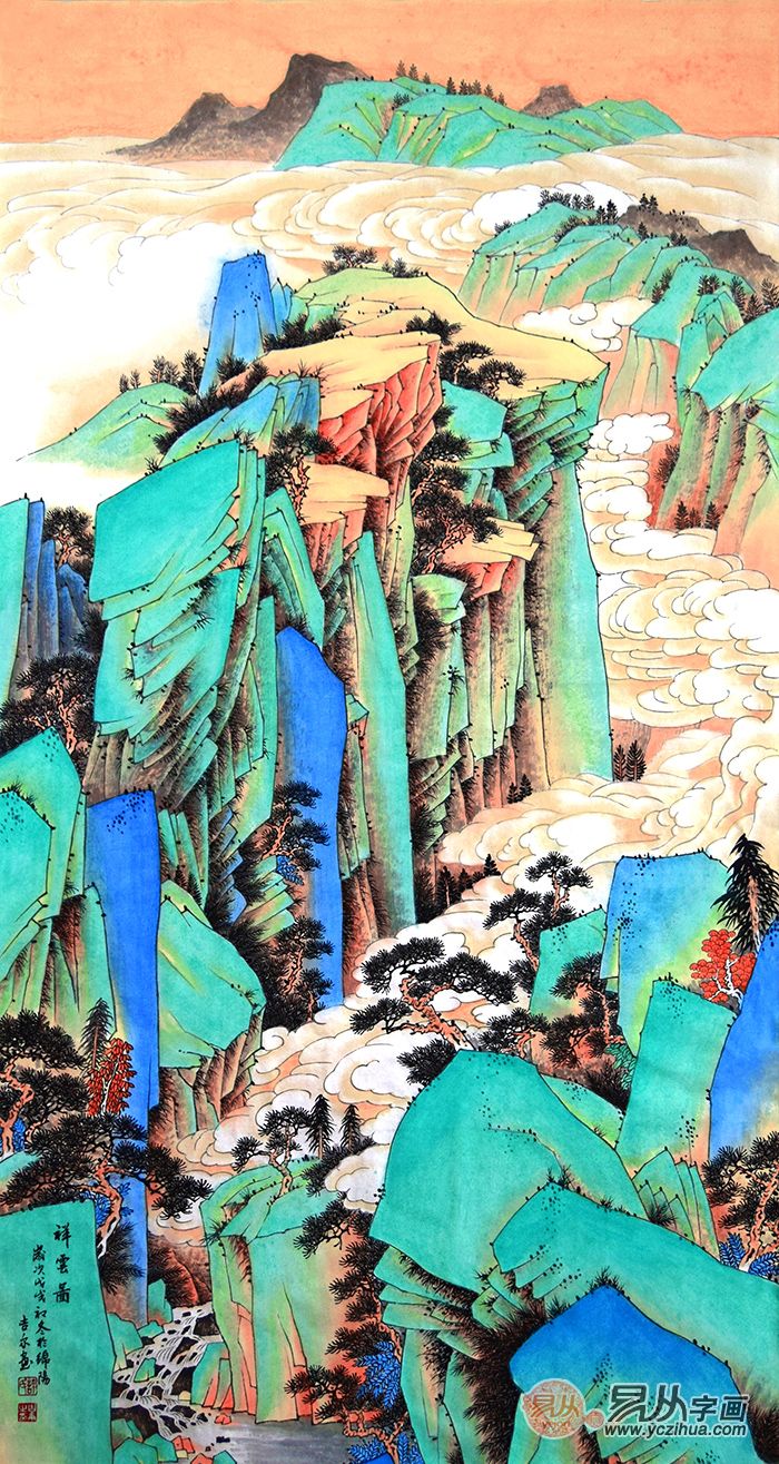 工笔山水画 许吉尔真迹创作四尺竖幅《祥云图》 作品来源:易从网
