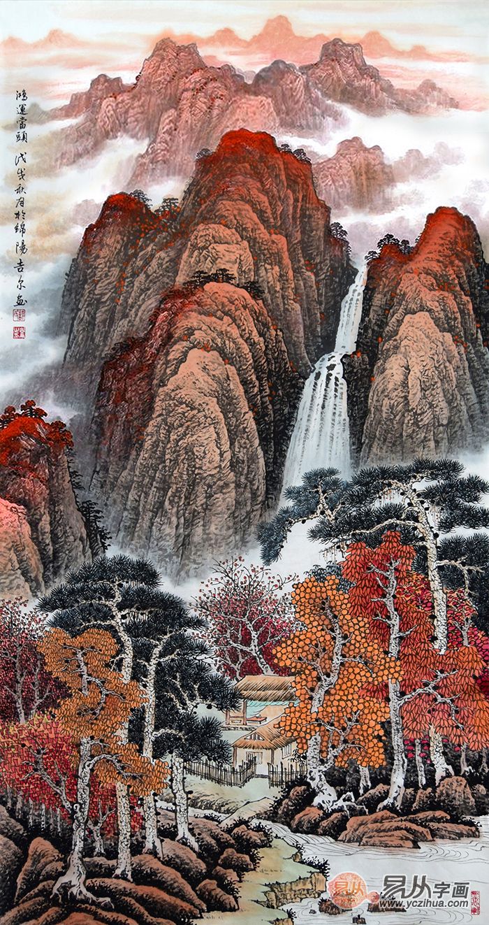 进门挂什么画寓意好?工笔重彩山水画装饰风水好!