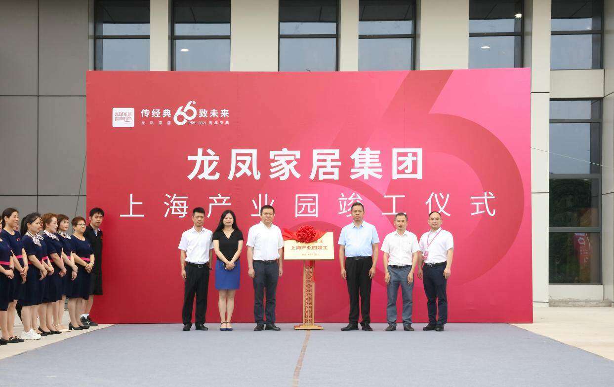 7月5日上午松江新桥镇及工业园区领导莅临龙凤家居集团上海产业园,和龙凤家居集团董事长祝卫良、董事总经理祝增荣,共同为新扩建的32000平米生产展示中心大楼竣工揭牌。