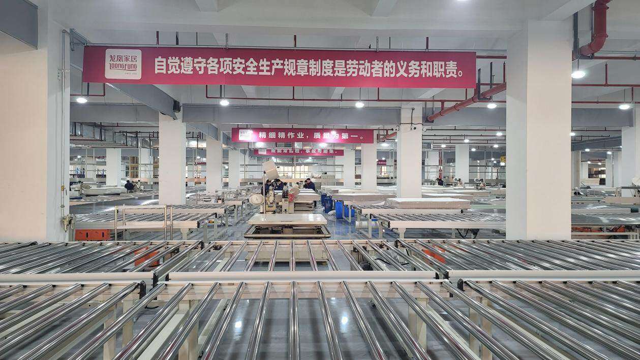 随着龙凤家居集团上海产业园扩建竣工,龙凤家居集团再次投资超千万元,购进先进的床垫制造设备,设计规划床垫自动化流水线,于2021年3月正式投入使用,自动化设备的投入不仅提高了生产效率和产品质量,也大大减轻了工作强度。