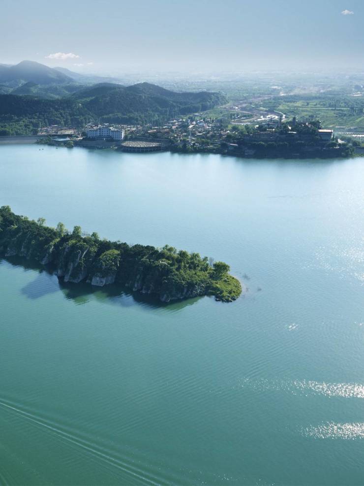 金海湖三面环山,山峰秀丽、水波浩渺。水域面积约9750亩,周边森林覆盖率达95%,可谓抬眼湖光山色,举目层峦叠嶂。