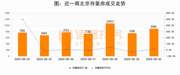 从存量房来看,2024年06月30日北京存量房单日成交896套,比昨日增加147套,环比上涨19.6%。从近一周存量房成交来看,北京存量房日均成交套数为808套,06月30日单日成交896套,高于近一周平均水平10.9%。