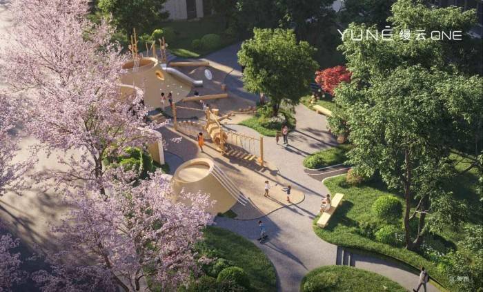在超尺度3.5万方垂直园林的基础上,缦云ONE打造了首个童话主题列车——格林号、400米夜光跑道、最美樱花大道等优享主题场景,同时引入联合国儿童友好社区标准和适老化设计要求,不论在空间还是功能上均进行迭代。