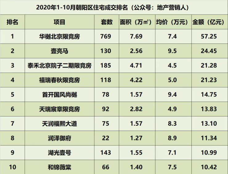 住建委数据,2020年1-10月,朝阳区住宅成交2441套,成交面积46.25万㎡。其中,华樾北京以769套成交量、57.25亿元成交金额的特别优势,高踞榜首。