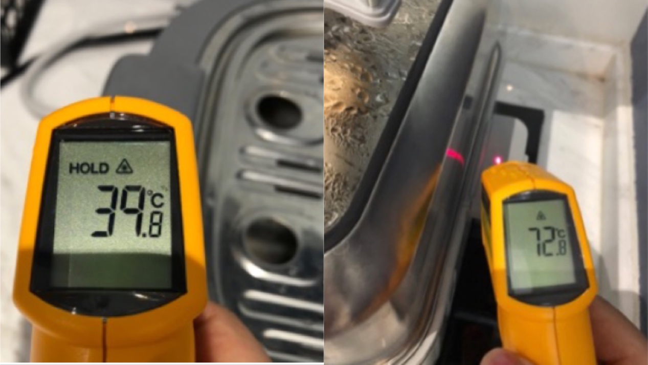 把摩飞和北鼎同时在蒸锅中注满水,选择蒸模式,蒸5min后摩飞手柄的温度是39.8°C,可以正常用手端拿,不会烫伤。而北鼎蒸5min后的手柄温度显示为72.8°C,手柄温度过高,直接用手拿取,很容易烫伤。